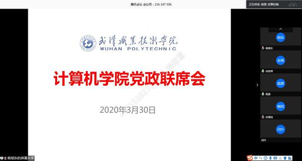 武职网讯(通讯员 毕忠宜)3月30日上午,计算机技术与软件工程学院组织空中工作会议,通过腾讯会议App依次召开线上党政联席会和党委中心组扩大学习会,分党委党委委员、教研室主任、支部书记、七级管理A参加会议,会议先后由计算机学院院长杨旭东、党委书记刘昌喜主持。