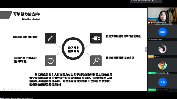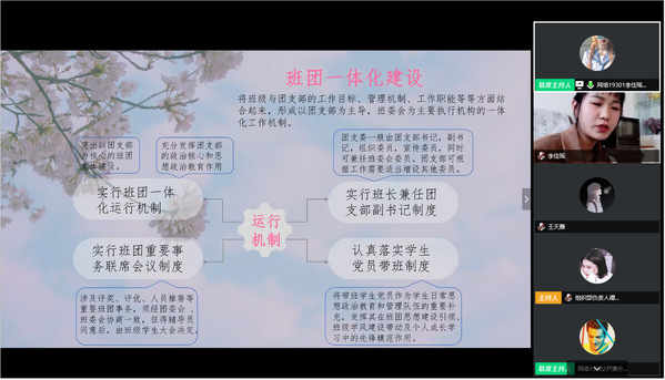 计算机技术与软件工程学院分团委书记陈澄最后总结道:“先进团支部通过‘云’展示的方式讲‘好做法’、‘好故事’,以此来提正精神、传递能量、激发活力。疫情期间,青年展现出了巨大的力量,希望青年学生可以向榜样学习,汲取成长养分,共同打赢这场没有硝烟的战‘疫’。”