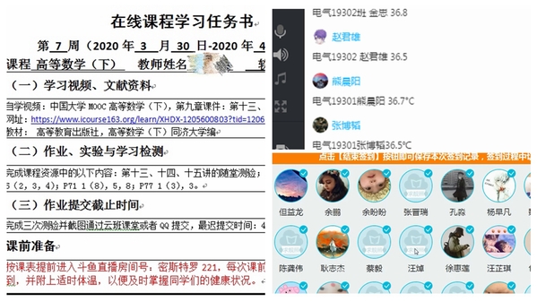 学习有指引,签到有温度。每周日晚,高数老师都会通过班级QQ 群下发下一周的《学习任务书》,指引学生做好课前准备,明确学习内容和重难点,鼓励学生“带着问题进直播”。每次课前五分钟,老师们都要求学生以“报告实时体温”的方式在蓝墨云班课上进行签到,不仅增强了学生对签到的认同感,同时也能及时掌握学生的健康状况,体现了老师对学生的关心关怀。