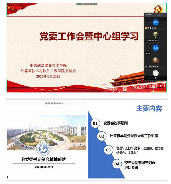 武职网讯(通讯员 毕忠宜5月25日上午10:00,计算机技术与软件工程学院召开线上党委会和中心组(扩大)学习会。计算机学院党委委员、支部书记、教研室主任、七级管理A参加了会议,会议由计算机学院分党委书记刘昌喜主持。