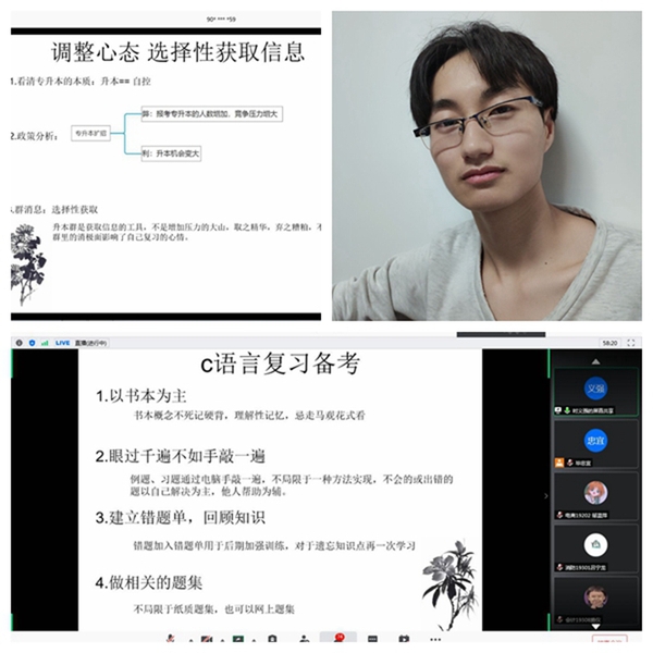 武职网讯(通讯员 彭雨)急求一份专升本“秘笈”!“上岸”学长与你面对面传经送宝,手把手点破迷津。6月7日晚,计算机技术与软件工程学院第14期百生讲坛《邂逅努力,致敬时光--升本经验交流会》在腾讯会议如期举行。本期活动邀请计算机技术与软件工程学院2名成功通过专升本考试的2019届毕业生担任主讲嘉宾,吸引了300余名学子前来“取经”。