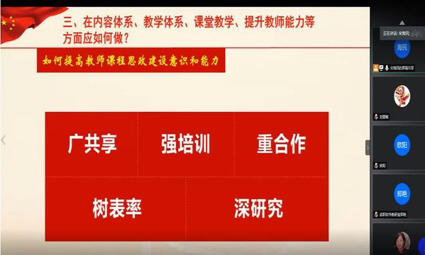 政治学习会上,刘雯敏老师领学了《教育部等八部门关于加快构建高校思想政治工作体系的意见》(以下简称《意见》),讲解了教育部出台意见的背景、指导思想、目标任务和七大体系。宋海民老师领学了《高等学校课程思政建设指导纲要》(以下简称《纲要》),针对《纲要》的背景、意义、推荐落实课程思政的工作目标、思路和要求,以及如何在内容体系、教学体系、课堂教学、教师能力等方面如何提升进行全面阐述。