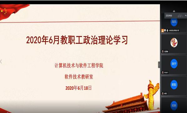 (通讯员 刘雯敏)6月18日下午14:15,计算机技术与软件工程学院软件技术教研室6月教职工政治理论学习在腾讯会议上举行,软件技术教研室全体老师参加了政治理论学习,会议由软件与数学党支部书记宋海民主持。