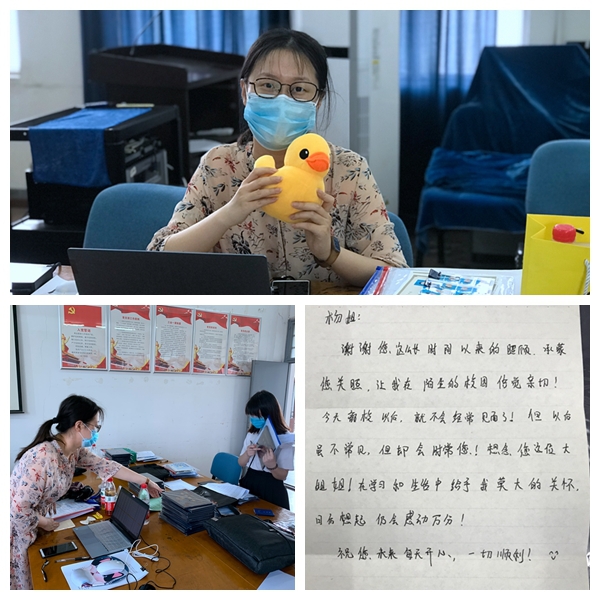 “谢谢学校的老师们,毕业了还给老师们添麻烦!失而复得的感觉真好!”在收到快递信息后,田若司发来感谢的消息,辅导员杨竞回复道:“不用谢,为学生服务是应该的。我也谢谢你送给我的礼物,祝你一路顺风!到家别忘了报平安哦!”原来,田若司来领毕业证时,还送给辅导员杨竞一封感谢信和一个玩偶作为纪念。杨竞打开感谢信,眼眶湿润了:“杨姐姐,谢谢你这么长时间以来的照顾,让我在陌生的校园倍感亲切,日后想起,仍会感动万分!祝你未来每天开心,一切顺利!”