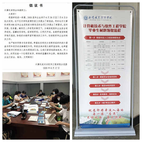 为周到、安全、有序做好毕业生返校工作,根据学校统筹部署和防疫要求,计算机技术与软件工程学院在全院教师中发出倡议,党员冲锋在前,勇挑重担,发挥模范带头作用,各个专业教研室积极联动,以生为本,细致安排,并制定了疫情防控应急处置预案,筑牢了疫情防控的“防火墙”,撑起了学生健康的“保护伞”。