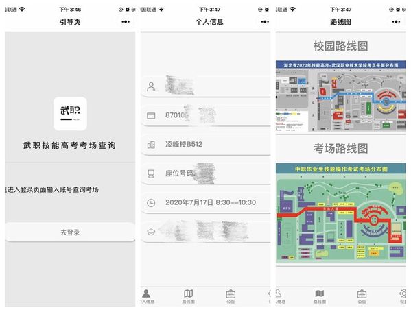 为帮助考生更加快捷便利地找到自己的考场,今年,计算机技术与软件工程学院对“智能考务”系统进行了升级,由计算机学院移动应用开发专业2019届毕业生毛宏涛、戢路自主开发的微信小程序“武职技能高考考场查询”,去年的查询系统上做了优化,不仅提供更为详实的考场信息和考生须知,还提供校园路线图和考场路线图等内容,考生使用微信扫码进入并输入身份证号,不到半分钟便可查到考试的时间、地点、座位号等信息,也可帮助现场考务人员快速查询考生信息,指引考生到达指定考场。