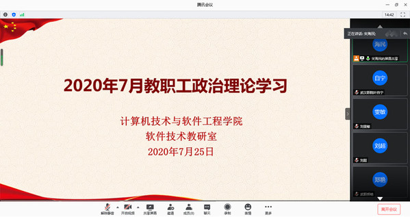 通讯员 叶自宁)7月25日上午9:30,计算机技术与软件工程学院软件技术教研室在腾讯会议上开展暑期线上教职工政治理论学习,软件技术教研室全体老师参加了此次学习,会议由计算机软件与数学党支部书记宋海民主持。