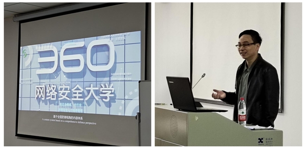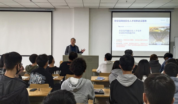 来自奇虎360湖北区域负责人黄浩为新生详细讲解了360网络安全教育体系,他说:“360网络安全大学旨在解决产业人才需求,专注于培养企业级应用型网络安全人才,助力网络安全强国建设。”