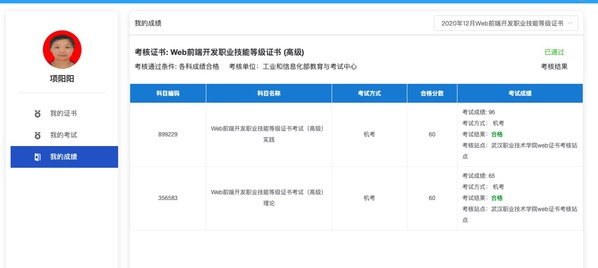 Web前端开发教学创新团队的刘班(上)、项阳阳(下)2位老师以实操技96分通过高级考试