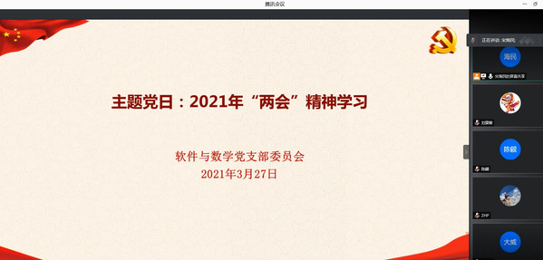 通讯员 刘雯敏)3月27日晚,软件与数学党支部在线上召开主题党日活动,主题为《2021年“两会”精神学习》。活动由支部书记宋海民主持,支部全体党员参加了此次活动。