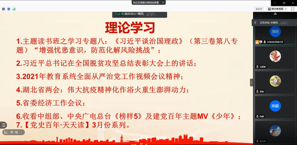 宋海民领学了《2021年政府工作报告》,并组织党员围绕2021年政府工作报告进行讨论发言。支部党员还集中开展理论学习,学习内容包括《习近平谈治国理政》第三卷第八专题“增强忧患意识,防范化解风险挑战”、习近平总书记在全国脱贫攻坚总结表彰大会上的讲话、2021年教育系统全面从严治党工作视频会议精神以及湖北省两会精神。