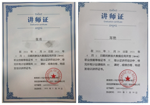 在为期6天的培训会上,计算机技术与软件工程学院的2位教师专心听课,动手实操,整理学习笔记,并以优异的成绩通过培训考核,获得大数据应用开发(Java)职业技能等级证书中级讲师认证。