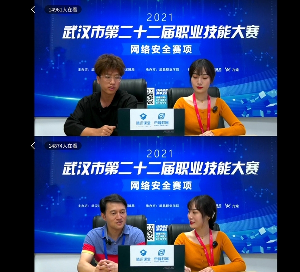 网络安全赛项我校一等奖获奖代表郁宏焜、指导教师江岚接受了腾讯直播采访