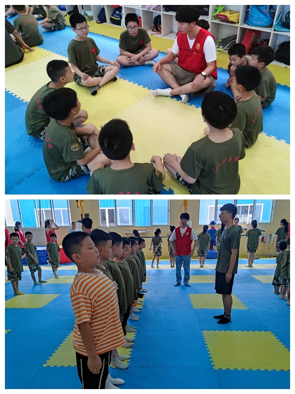 白天,志愿者们在军事夏令营中辅助军事教官,通过全方位、立体化、直观性的军营体验式的教学活动,帮助小小学员们养成独立自主的生活能力和良好的生活习惯,培养小小学员们坚强、刚毅、雷厉风行的军人品质和良好的团队合作意识。