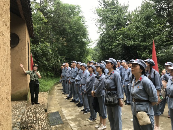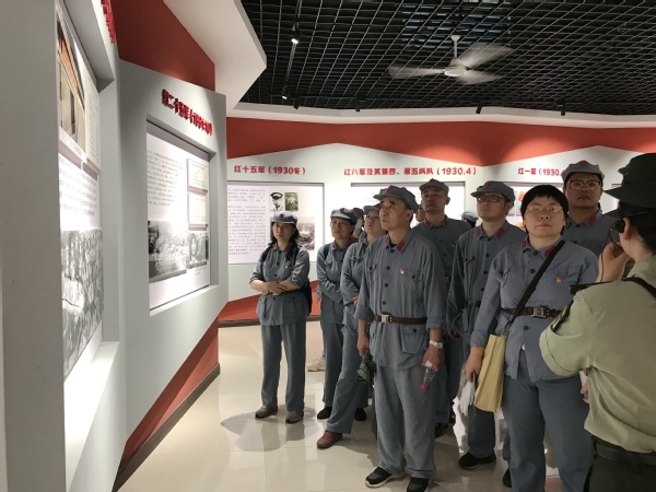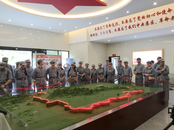 红军餐后,大家不畏雨后闷热的天气,开始重走红二十五军长征微缩路,一路参观了“血战牛背脊骨”、“袁家沟口大捷”、“何家冲誓师”等战斗场景。