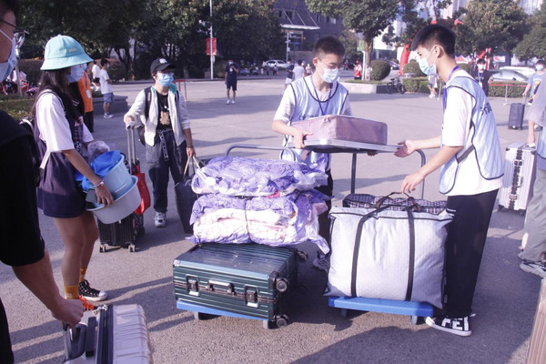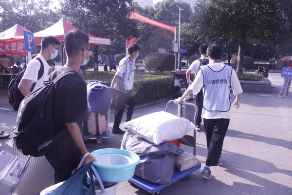 因为疫情防控的要求,家长不能入校,每位新生入校后,就有一到两名志愿者上去迎接,既当“搬运工”,又当向导,帮助新生熟悉校园环境、了解校园文化。从校门口到休息等待区,从登记点到宿舍楼,从东校区到西校区,处处都有他们的影子。他们头顶烈日、脸淌汗水、手推拖车,一遍又一遍地往返于各栋宿舍楼之间,将独自进校的小萌新们送至各自住所,也送进了他们进期待已久的大学生活。