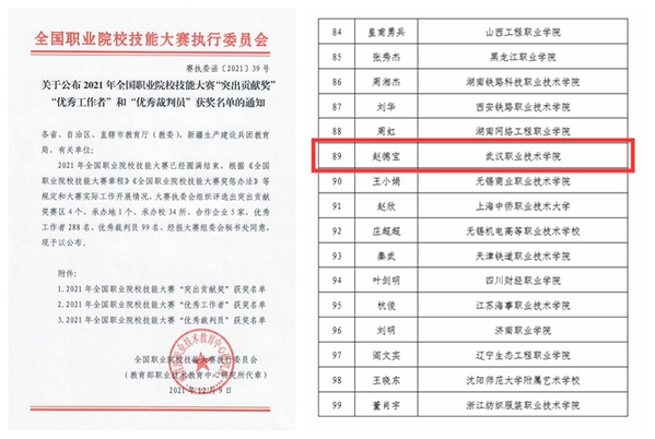 武职网讯(通讯员 辜璇) 日前,全国职业院校技能大赛执行委员会发布了《关于公布2021年全国职业院校技能大赛“突出贡献奖”“优秀工作者”和“优秀裁判员”获奖名单的通知》,武汉职业技术学院教师、信创教研室主任赵德宝获评2021年全国职业院校技能大赛“优秀裁判员”。