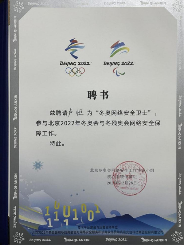 近年来,武汉职业技术学院积极响应国家发展网络安全的重大战略和培养优秀网络空间安全人才的重大需求,为网络空间安全专业领域培养输送优秀人才。2020年8月,学校首创成立信创学院,并与奇安信湖北分公司紧密联系对接、开启合作之旅。2021年,信创学院与奇安信虎符基地签署订单班合作协议,校企双方深度融合,携手培养信息安全技术技能型人才。2021年底,获悉北京冬奥组委技术部牵头组织招募白帽子作为“冬奥网络安全卫士”参与冬奥网络安全工作,学校积极组织学生报名。经过层层筛选,信创学院2020级计算机网络技术(网络安全方向)专业学生、阳明(网安)工作室成员卢恒凭借扎实的专业知识和优良的综合素质成功入选“冬奥网络安全卫士”,这标志着武汉职业技术学院信息安全人才培养工作获得信息安全头部企业认可,展现了学校人才培养质量和信息技术应用创新教育成果。