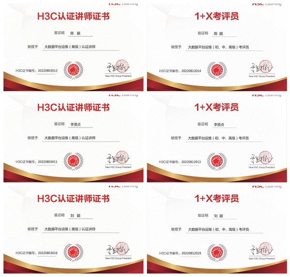 新华三“1+X”大数据平台运维职业技能等级证书“高级讲师”和考评员认证证书