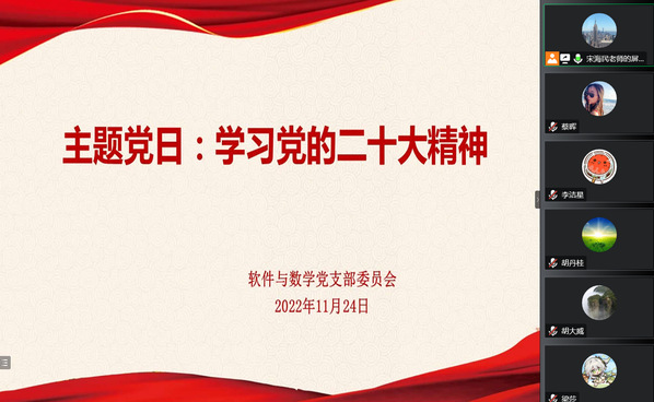 通讯员 蔡晖2022年11月24日下午,软件与数学党支部在线上召开主题党日活动,主题为《学习党的二十大精神》。活动由支部书记宋海民主持,支部全体党员参加了此次活动。