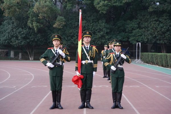 上午6点50分,升旗仪式正式开始。英姿飒爽的国旗仪仗队队员迈着铿锵有力的步伐,护送鲜艳的五星红旗入场。五星红旗伴随着雄壮嘹亮的国歌声冉冉升起,迎风飘扬。