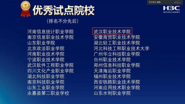 武职网讯(通讯员 陈觎)3月25日上午,教育部第三批1+x证书制度职业教育培训评价组织新华三集团2022年度1+X试点工作总结表彰及2023年度工作说明会在云端举行。本次会议上,新华三集团对2022年度1+X工作开展中的优秀院校进行了表彰,武汉职业技术学院荣获2022年度“1+X大数据平台运维职业技能等级证书优秀试点院校”荣誉称号。