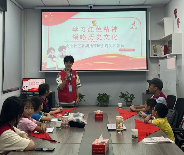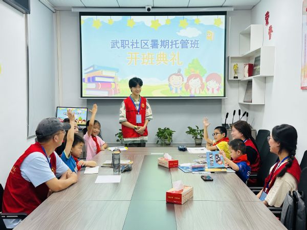 “小朋友们好,我们是来自武汉职业技术学院计算机学院的志愿者,很高兴能够与你们相遇,希望接下来我们能一起度过这段快乐的暑期时光。”上午9时,暑期托管工作正式开始,团队成员统一身着红马甲,走进小课堂与小朋友们见面互动