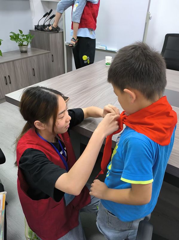 志愿者教授小朋友正确佩戴红领巾