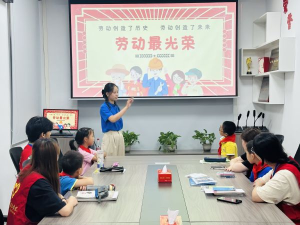 随后,共青团洪山区委暑期托管班指导老师吴瑶为小朋友们讲授“悦劳动悦成长”主题课程。吴瑶介绍了”五一国际劳动节”的由来,并讲述了杰出劳动模范的故事和先进事迹,教导小朋友“职业不分贵重,每一位劳动者都是一座城市的靓丽景色”。小朋友们聆听讲解,了解了各行各业劳动者,并依次分享了自己家长的职业,向父母表示感恩。