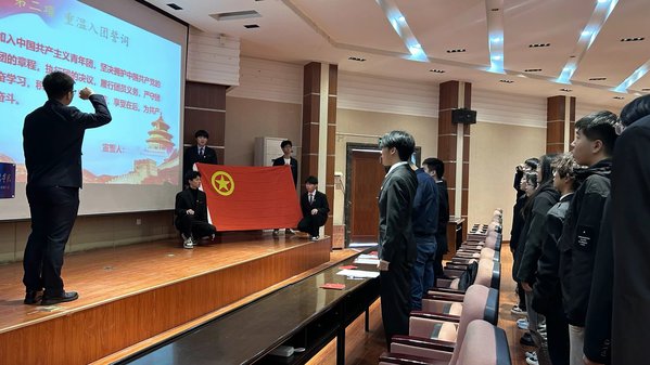 12月8日,计算机学院新发展团员入团仪式在凌峰楼C21报告厅举行。仪式现场,44名新团员面向团旗庄严宣誓、老团员为新团员代表佩戴团徽,新老团员优秀代表发言。