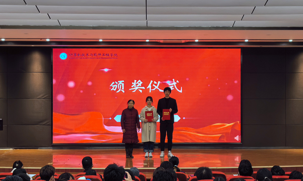 计算机学院党委书记、院长刘昌喜为国奖学子杨楷(右)、竺雨青(中)颁奖