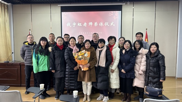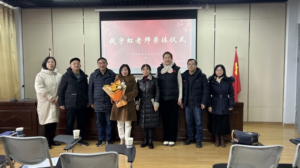 荣休仪式上,武静宣读了《致退休教职员工的慰问信》,代表全体教职工向钱宇虹老师表达真挚的慰问。杨忠旭、梅红明分别代表校工会、离退休工作处向钱宇虹老师表达了深深祝福。计算机学院软件技术教研室主任梁莎为钱宇虹老师送上鲜花和纪念品。